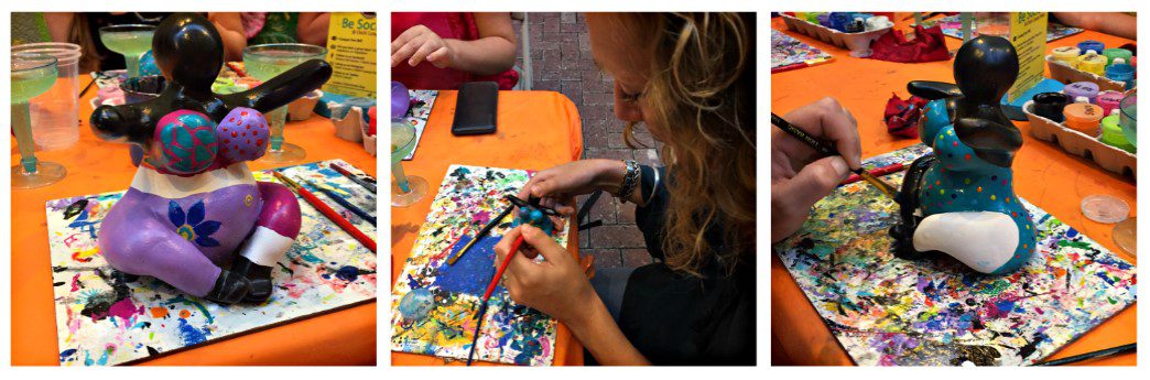 At the Chichi® Punda Shop, many Chichi® sculptures are constantly displayed, looked at and bought by tourists. On Thursday around six o’clock something special happened. Six tourists were painting these sculptures in an alley called the Art Alley in the city, Punda. A lot of people seem to love the Chichi® dolls. I can’t tell you how often I heard people saying phrases like “Oh, look, you’re painting!”, “You can paint your own souvenir!” and “How beautiful!” There was no one who didn’t stop to admire what the tourists were creating during the workshop.