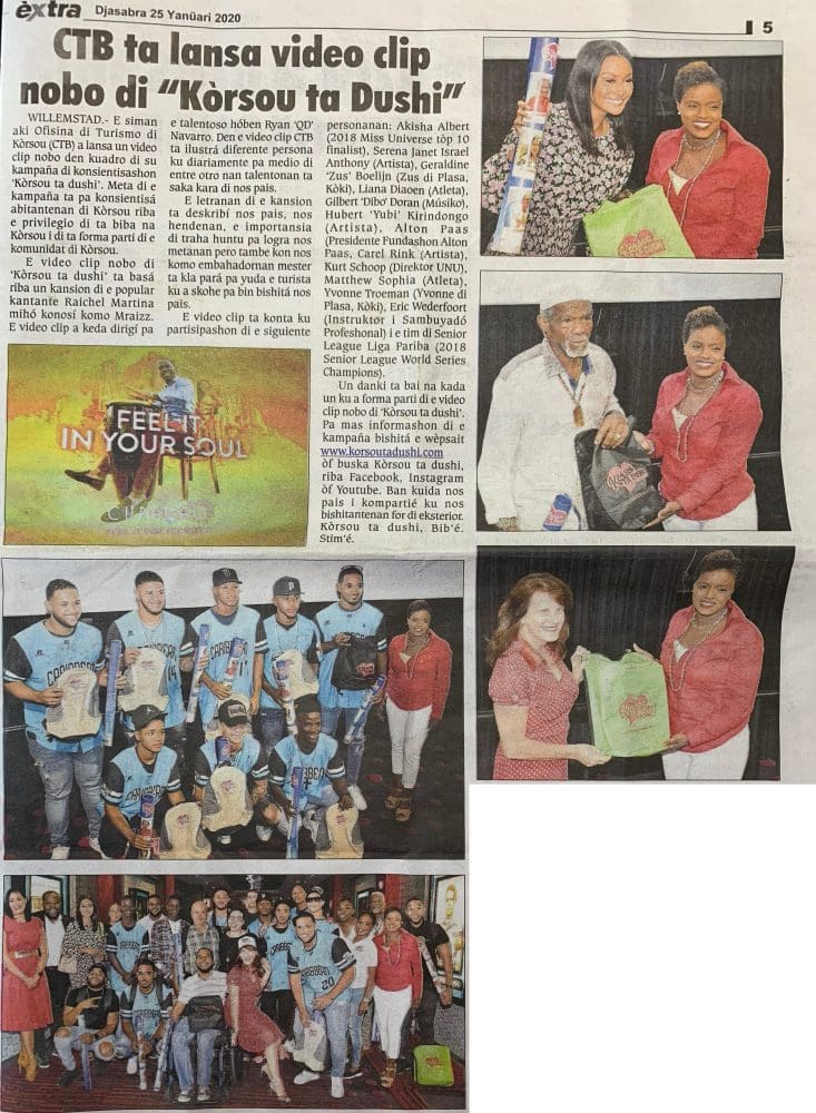 The lyrics describe our country, our people and the importance of working together towards common goals, while drawing attention to the fact that we are in fact the island’s ambassadors and should always be ready to assist visitors who have chosen our country as a destination. The video clip features: 2018 Miss Universe top-10 finalist Akisha Albert, artist Serena Janet Israel Anthony, cook Geraldine “Zus di Plasa” Boelijn, athlete Liana Diaoen, musician Gilbert “Dibo” Doran, artist Hubert “Yubi” Kirindongo, Alton Paas (President of the Alton Paas Foundation), artist Carel Rink, UNU Director Kurt Schoop, athlete Matthew Sophia, cook Yvonne (di Plasa) Troeman, professional diver and instructor Eric Wederfoort and 2018 Senior League World Series Champions – the Liga Pariba team.