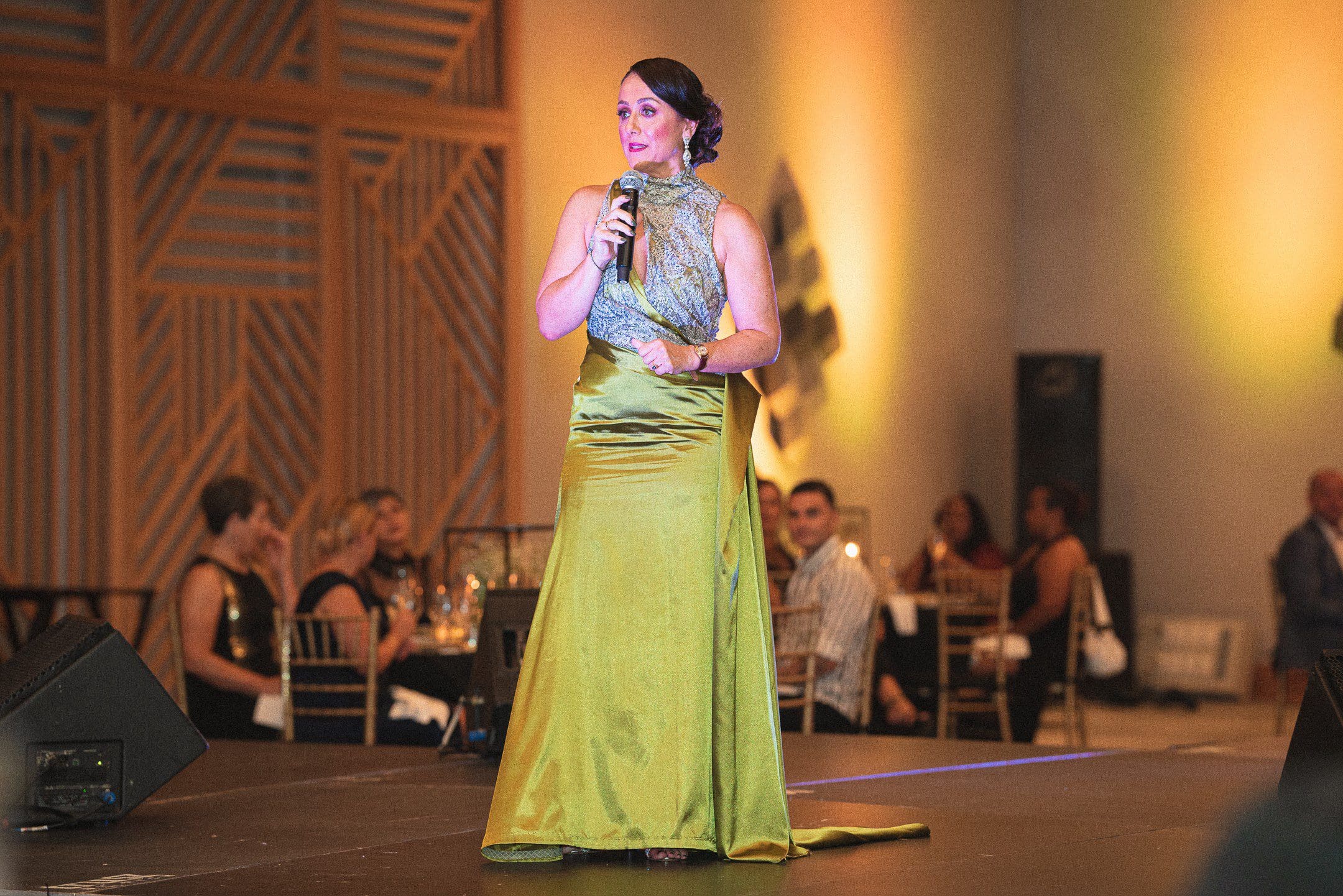 The evening started with the guests arriving at the Royal Plaza of the Curaçao Marriott Beach Resort where they could mingle and take photos at the CHATA backdrop before heading inside. Once inside, the guests could admire the beautiful artwork by the many different artists who were also near to present their art. While walking down the foyer the guests encountered the moving sculpture before enjoying the performance by the dance groups. It wasn’t long until they could finally enter the dining hall which was decorated beautifully with black and gold accents and had talented violinist Mr. CJ Opus playing. Due to the new Government regulations, CHATA assured that the low-risk event was complying with all regulations and guests would enter the dining hall in groups to avoid agglomeration.