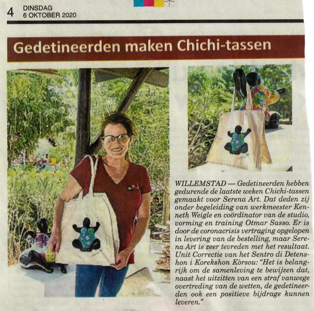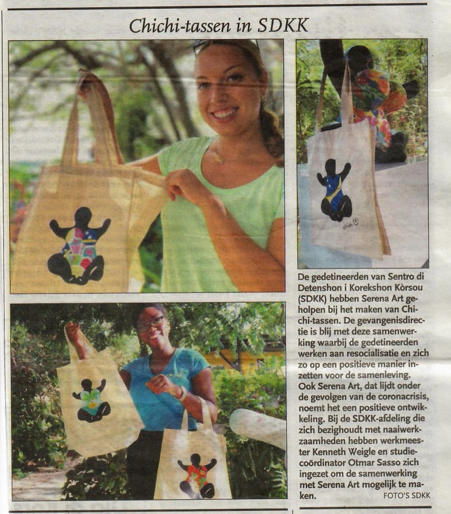 Vorige week stonden we in twee kranten vanwege onze positieve samenwerking met Sentro di Detenshon i Korekshon Kòrsou (SDKK), gevangenis van Curaçao. Samen met werkmeester Kenneth Weigle en coördinator van de studio vorming en training Otmar Sasso hebben we het mogelijk gemaakt om gedetineerden Chichi draagtassen te laten maken.