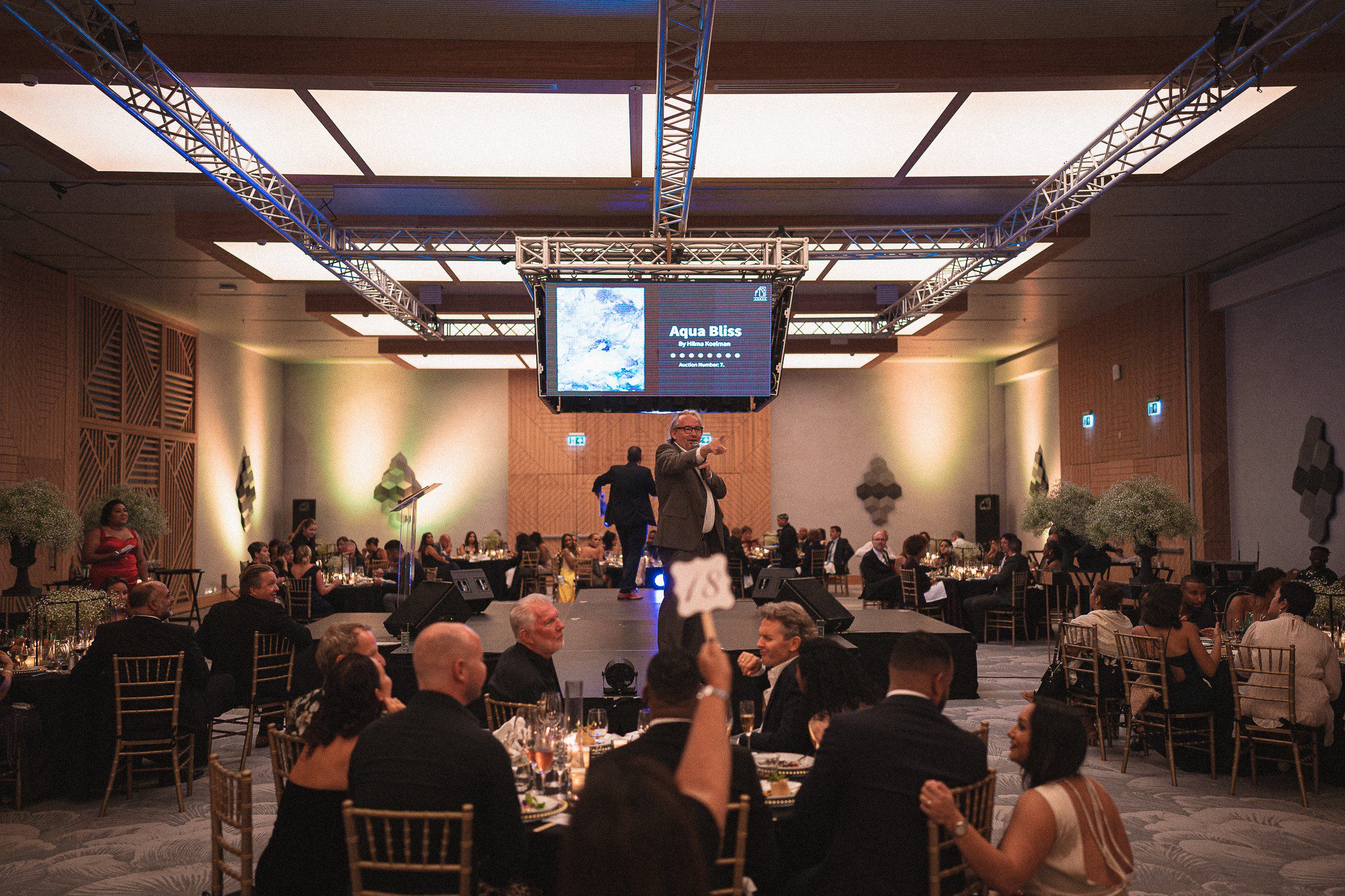 Na de presentatie van dhr. Asporaat werd er geborreld en gedineerd met een viergangenmenu vergezeld van een wijnarrangement. Tussen de gangen door vermengden de gasten zich met andere gasten die aan hun tafels zaten voordat de kunstveiling begon. De kunstveiling omvatte werken van lokale kunstenaars: Mishenu Cicilia, Christy Prins, Mirjam de Castro, Hilma Koelman, Hortence Brouwn, Serena Israel, Rochelle Monte, Marja Tukker, Avantia Damberg, Esmeralda Kelly, Monique Harbers, Margarita Haakmat, Merly Trappenberg, Morgaine Parris, Pito Polo, Gwen Anderson en Suzet Rosaria. CHATA is zeer verheugd dat alle kunstwerken een thuis hebben gevonden tijdens het Gala Benefiet Diner. Serena Israel heeft een outdoor Chichi® beschikbaar gesteld voor de veiling en is trots dat deze voor $1.000,- is verkocht om nog meer geld op te halen voor CHATA.